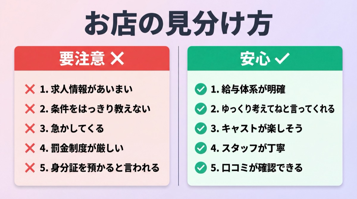 お店選びで大切なのは、焦らないこと。いくつかのお店を見比べて、「ここなら安心して働けそう」と思えるお店をじっくり探してみてくださいね。
