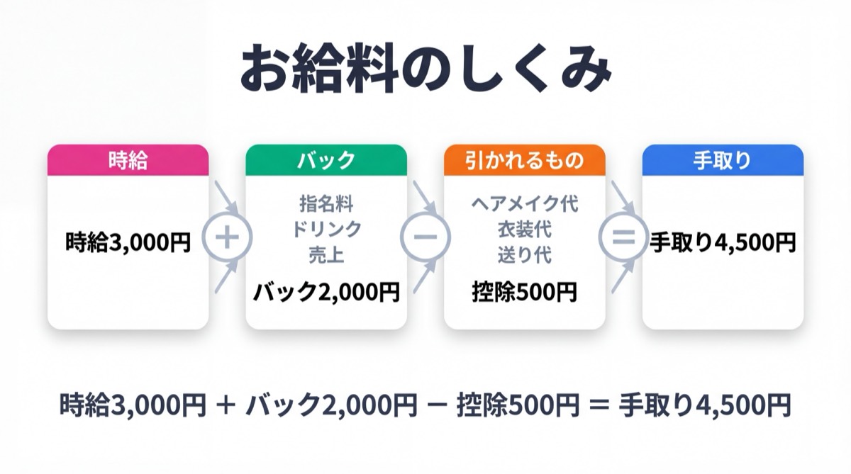 夜職のお給料は「時給+バック(歩合)」で構成されているのが一般的です。時給だけで比較してしまうと、実際の手取りとイメージが違った…なんてことも。