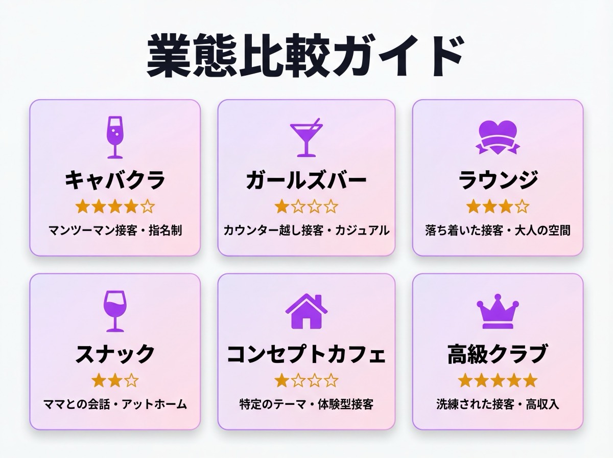 夜職と一口に言っても、業態によって雰囲気や働き方はかなり違います。自分に合った業態を知ることが、お店選びの第一歩です。